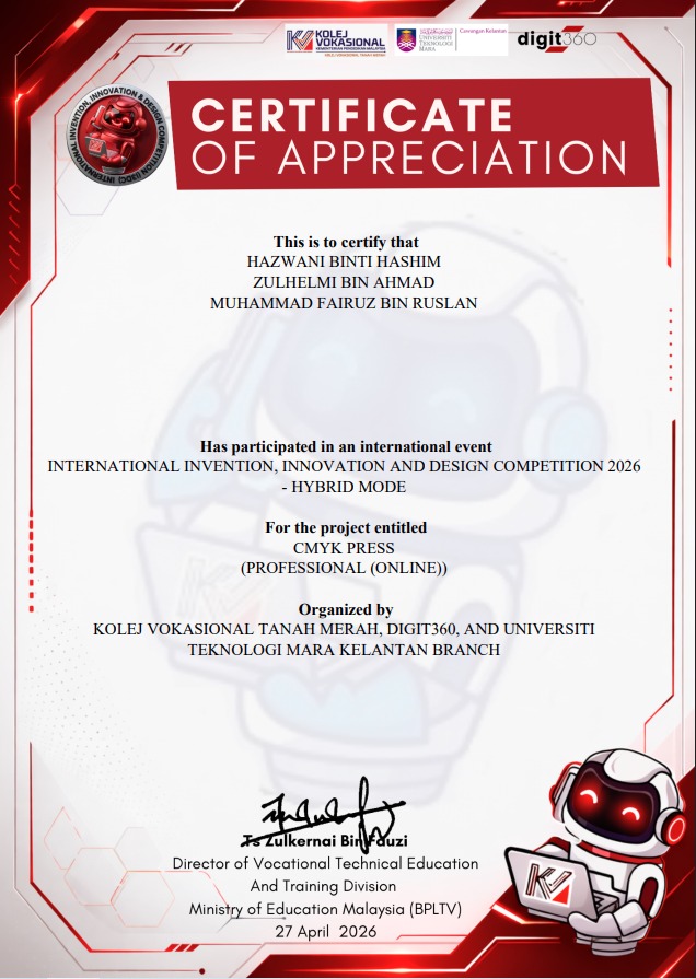 Pasukan PMS diketuai oleh Hazwani Binti Hashim bersama ahli kumpulan Zulhelmi Bin Ahmad dan Muhammad Fairuz Bin Ruslan, yang merupakan pensyarah Program Diploma Teknologi Media Cetak (DMC_WBL). Mereka telah mengetengahkan projek inovasi bertajuk CMYK PRESS, yang menampilkan gabungan kreativiti, reka bentuk dan inovasi dalam bidang percetakan serta komunikasi visual.