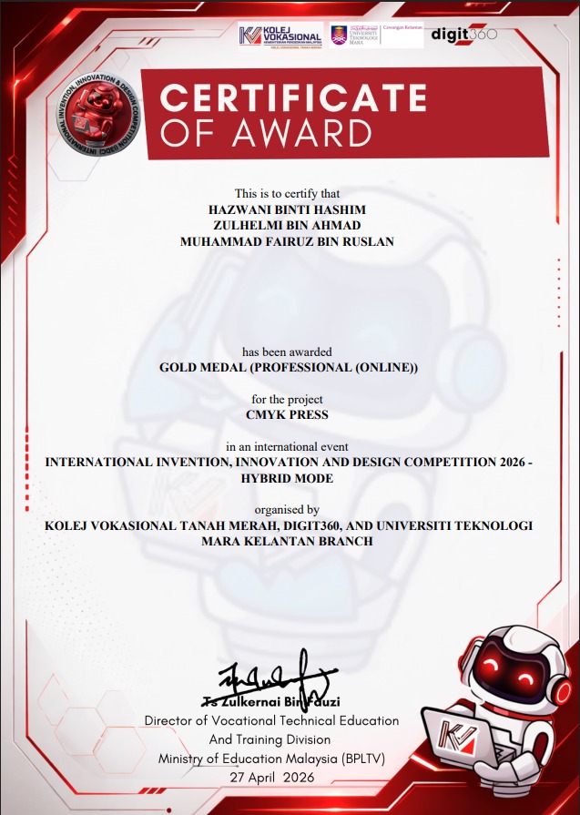Muadzam Shah, 27 April 2026 – Pasukan inovasi daripada Jabatan Rekabentuk dan Komunikasi Visual, Politeknik Muadzam Shah (PMS) mencipta kejayaan membanggakan apabila meraih Pingat Emas (Kategori Profesional – Dalam Talian) dalam International Invention, Innovation and Design Competition 2026 (Hybrid Mode).