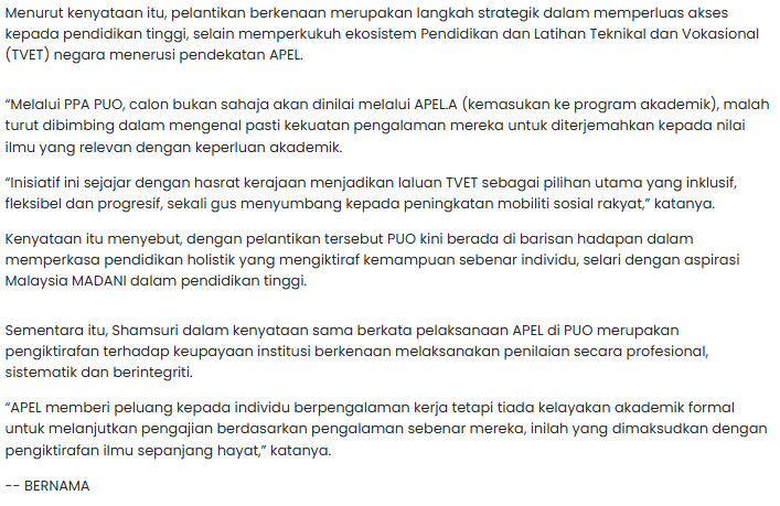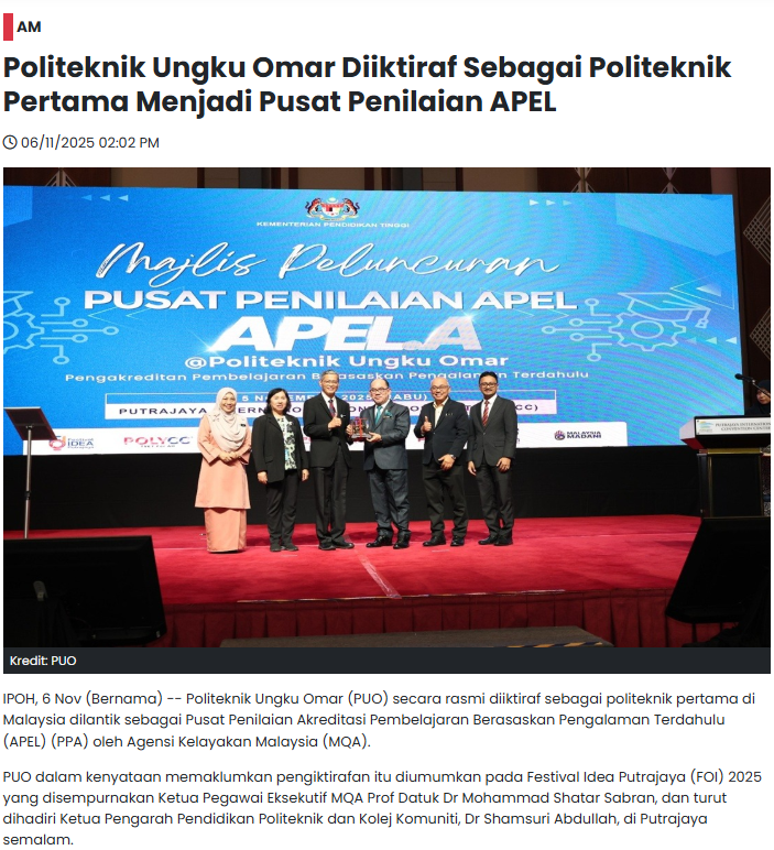 Keratan Akhbar : Politeknik Ungku Omar Diiktiraf Sebagai Politeknik Pertama Menjadi Pusat Penilaian APEL